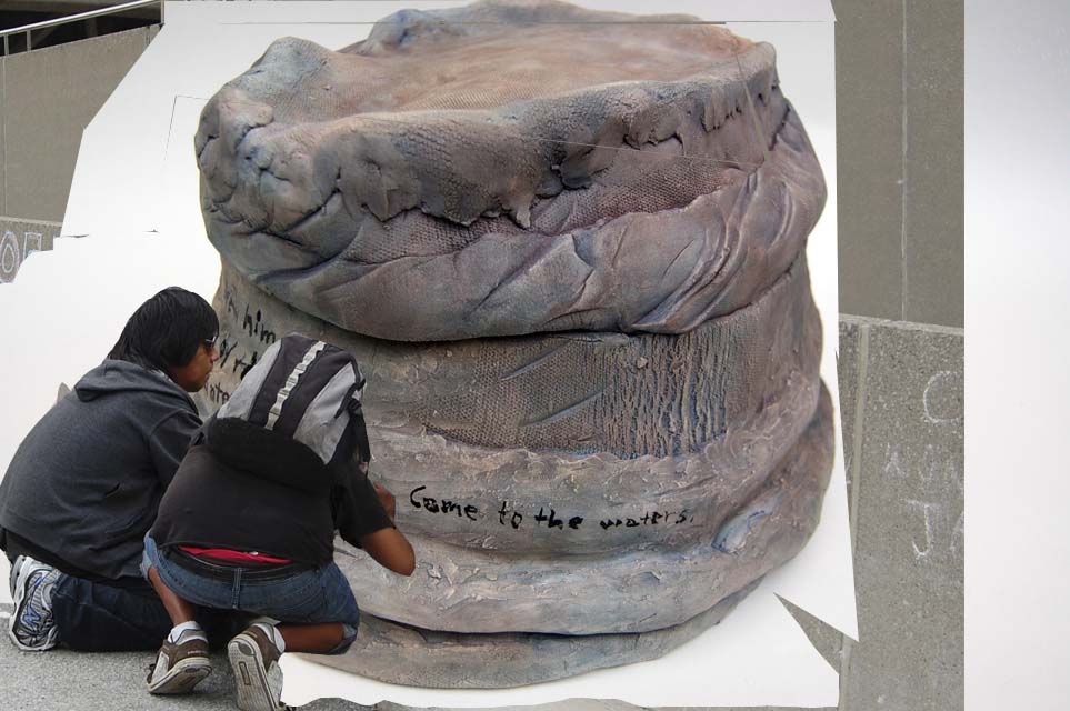 We do have hope. [This yurt is hand-built, cone 10, bisque fired]. I superimposed a picture of this yurt with two people who were writing their hopes in graffiti on its walls. The yurt is also a symbol of encampments, all the tents that people with no housing are using to protect themselves from the elements. Our hope is that we continue with giving witness and telling stories, just as Lumy helped us in 2019 at the Gardiner Museum’s “Community Arts Project: What We Long For”. We engaged with a thousand pairs of hands in the creation of a thousand clay Monarch butterflies, the metaphor for what we yearn for: a loving community that would honour each other’s gifts and abilities. We want a change in our immigration policies that would advocate a landed status for all. We want to reclaim the ancient wisdom in producing food that honours air, land, water and biodiversity where every person is treated with the same dignity, respect and consideration.